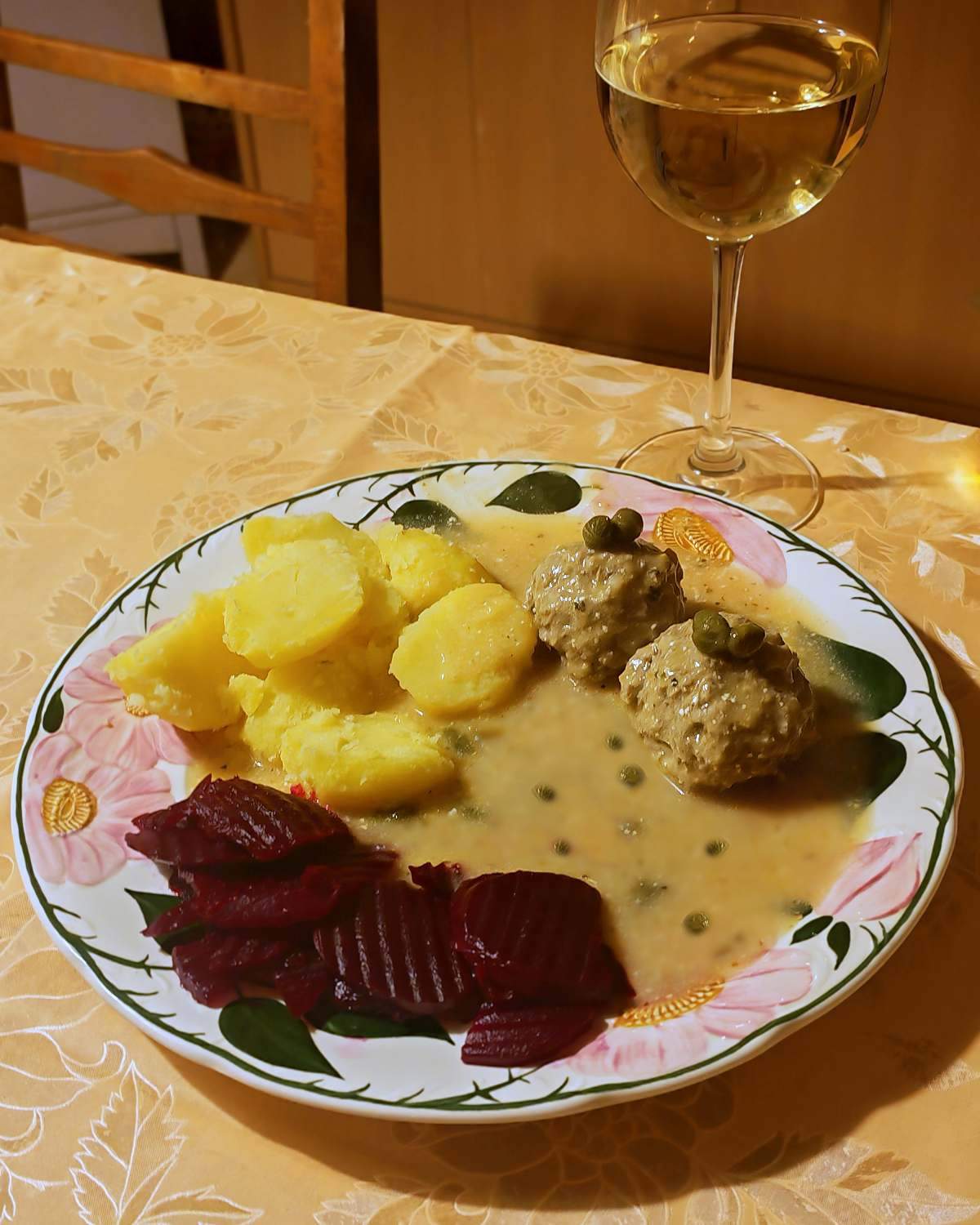 | Königsberger Klopse werden traditionell mit Petersilienkartoffeln und Roter Beete serviert.
